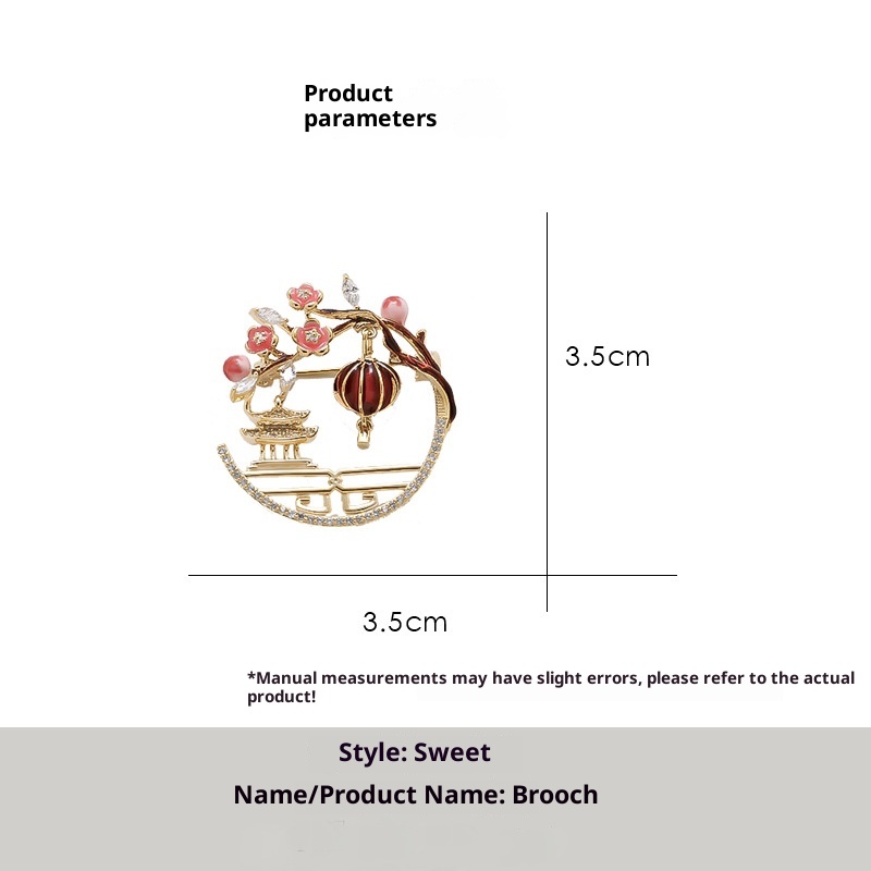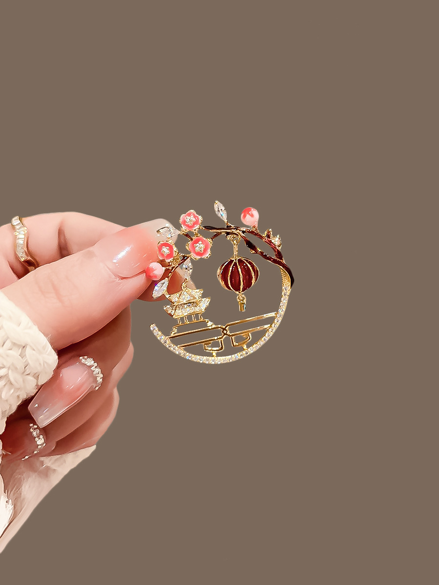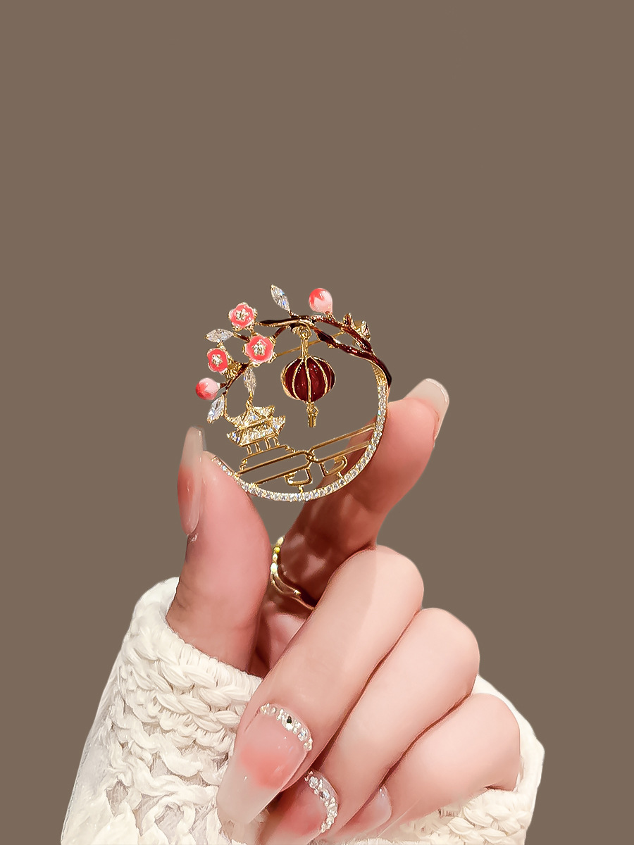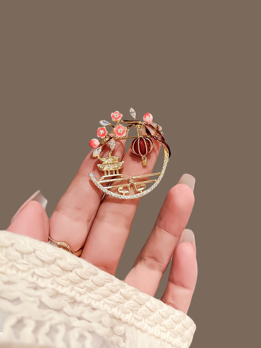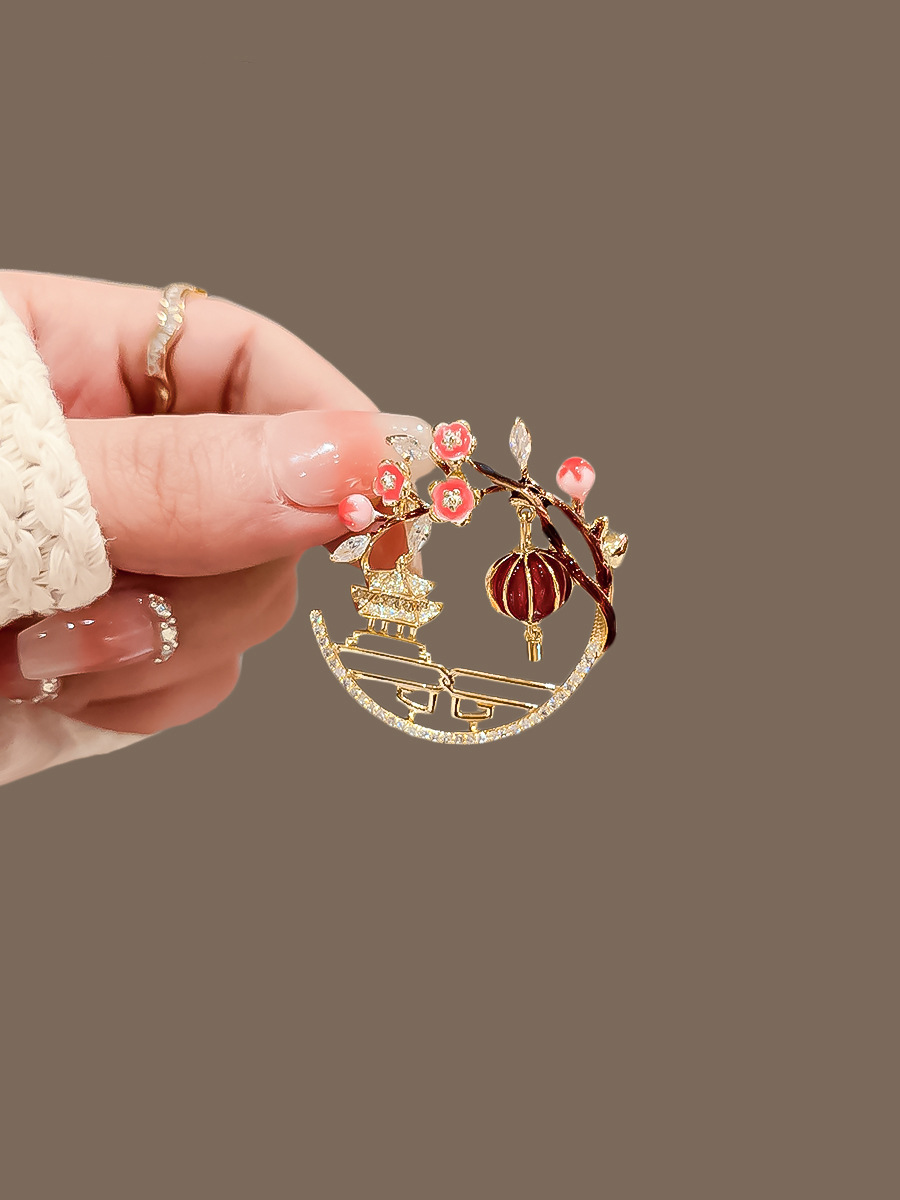 Chinese-style Red Plum Blossom Pavilion Ancient Tower Lantern Brooch